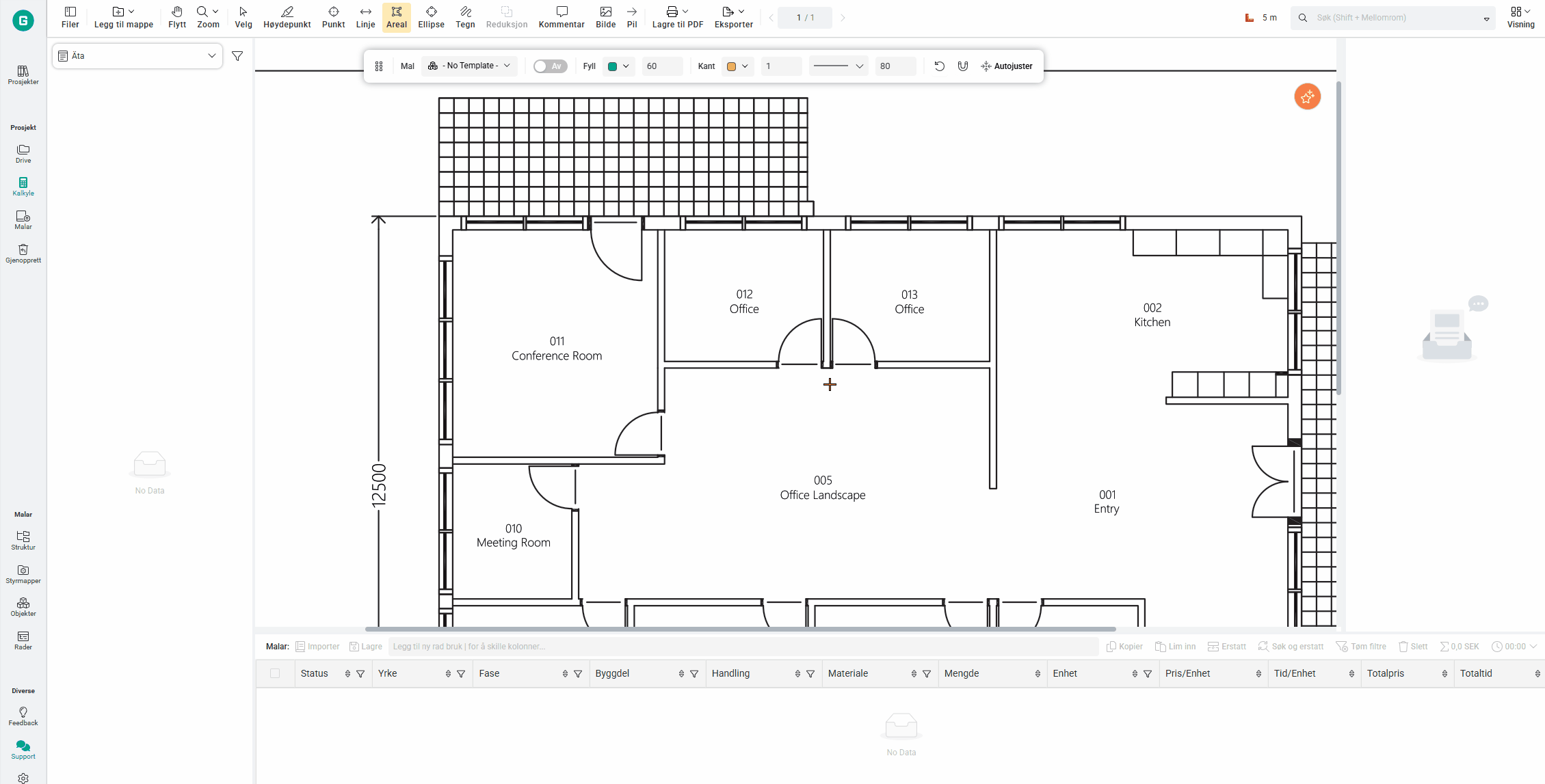 Med Areal-verktøyet får du ut flest verdier å jobbe med. Du får brutto- og nettoverdier samt ytre dimensjoner for objektet. Har du plassert en eller flere reduksjoner på et areal, får du også det totale reduserte verdien å jobbe med på radene. Reduserte verdier påvirker nettoverdiene for området og inkluderes automatisk.