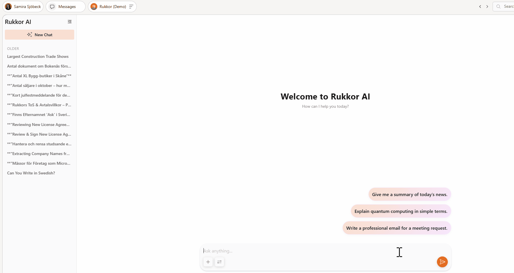 Rukkor använder artificiell intelligens för att göra kommunikationen smartare och mer effektiv. Wingman kan läsa och analysera filer som du har godkänt, skapa automatiska sammanfattningar, transkribera möten, ge smarta svarsförslag och förbättra sökfunktionen i meddelanden och filer. Alla AI-funktioner är designade för att skydda din integritet och göra samarbetet enklare utan extra arbete.